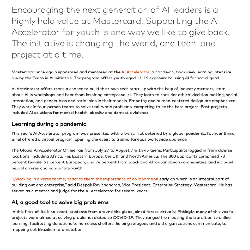 Through this groundbreaking collaboration between Teens in AI and Mastercard, we were able to ignite innovation and cultivate a generation of ethically-minded AI pioneers, empowering them to harness the power of technology for positive social change and effectively address the UN SDGs.
