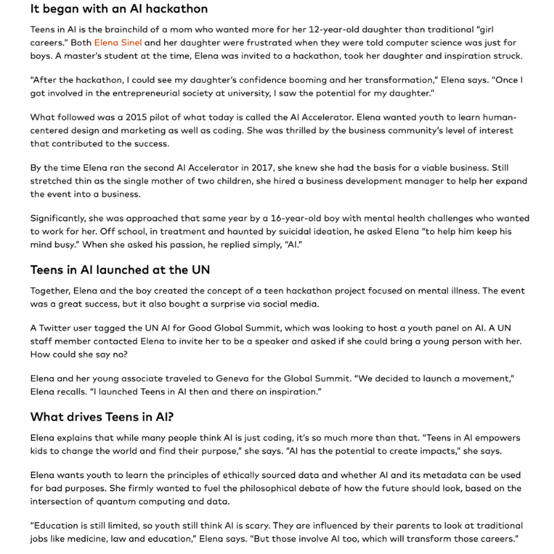 A hands-on, two-week learning intensive programme offered teens a chance to build their own tech start-up with the help of industry mentors, learn about AI in workshops and hear from inspiring entrepreneurs. Teens learned to consider ethical decision making, social interaction, gender bias and racial bias when developing their projects. The programme culminated in a Demo Day where teams presented their projects to a panel of judges.