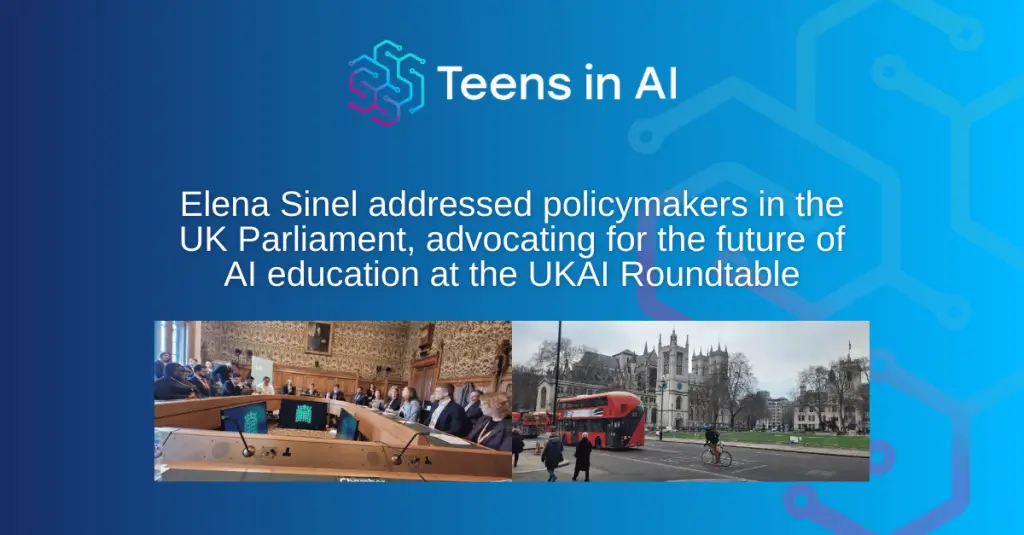 Elena Sinel, founder of Teens in AI, attended the UK Parliament to champion the future of AI Education at the UKAI Roundtable. She addressed policymakers on the urgent need to equip young people with the skills to thrive in an AI-driven world.
