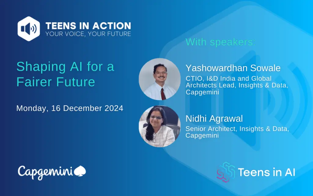 Join Teens in AI and CapGemini, on a session with Nidhi Agrawal and Yashowardhan Sowale on Shaping AI on a Fairer Future with AI Ethics and Generative AI.