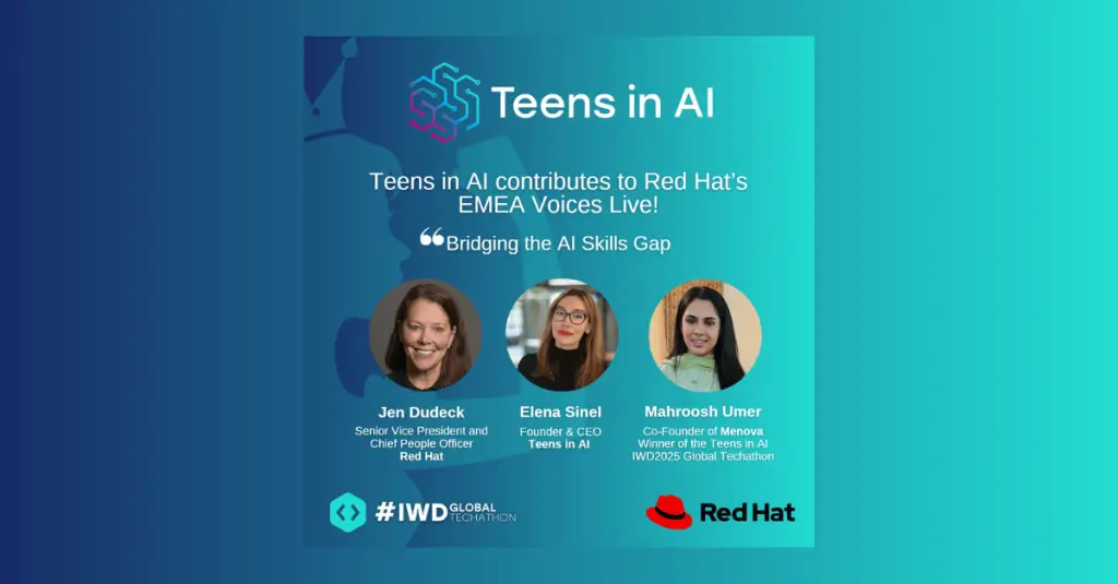 Teens in AI was proud to join a panel discussion with Red Hat on Bridging the AI Skills Gap. Our Founder, Elena Sinel; Mahroosh from Team Futuristaan, the winning team of the Teens in AI Global Techathon 2025; and Jen Dudeck, Senior Vice President and Chief People Officer at Red Hat, spoke at length about the opportunities – and challenges – that AI presents.